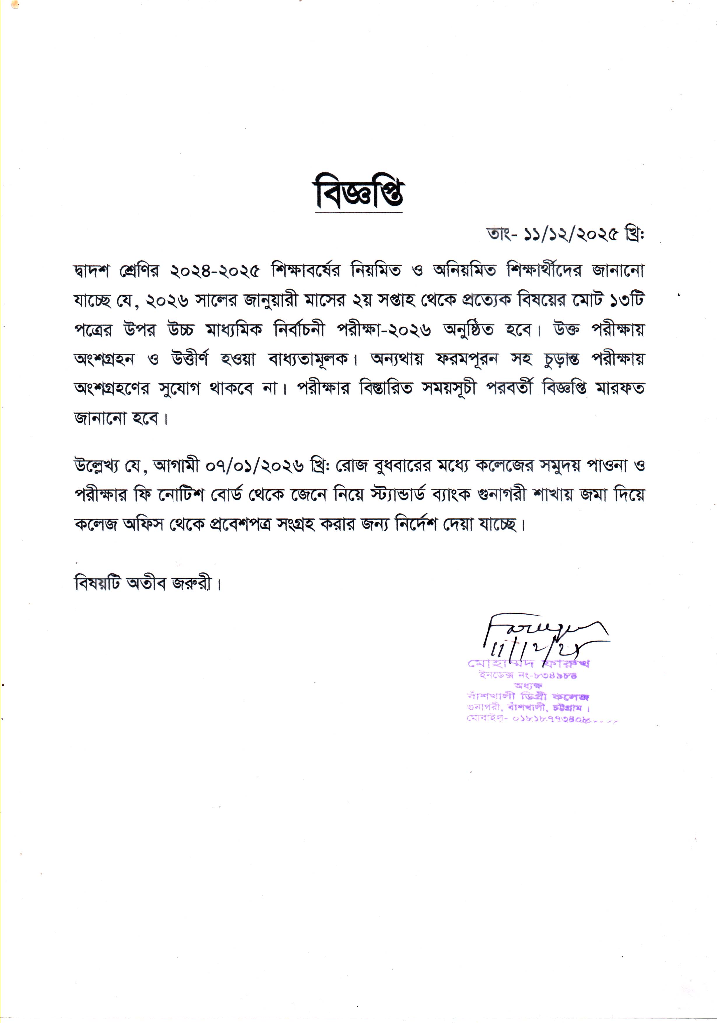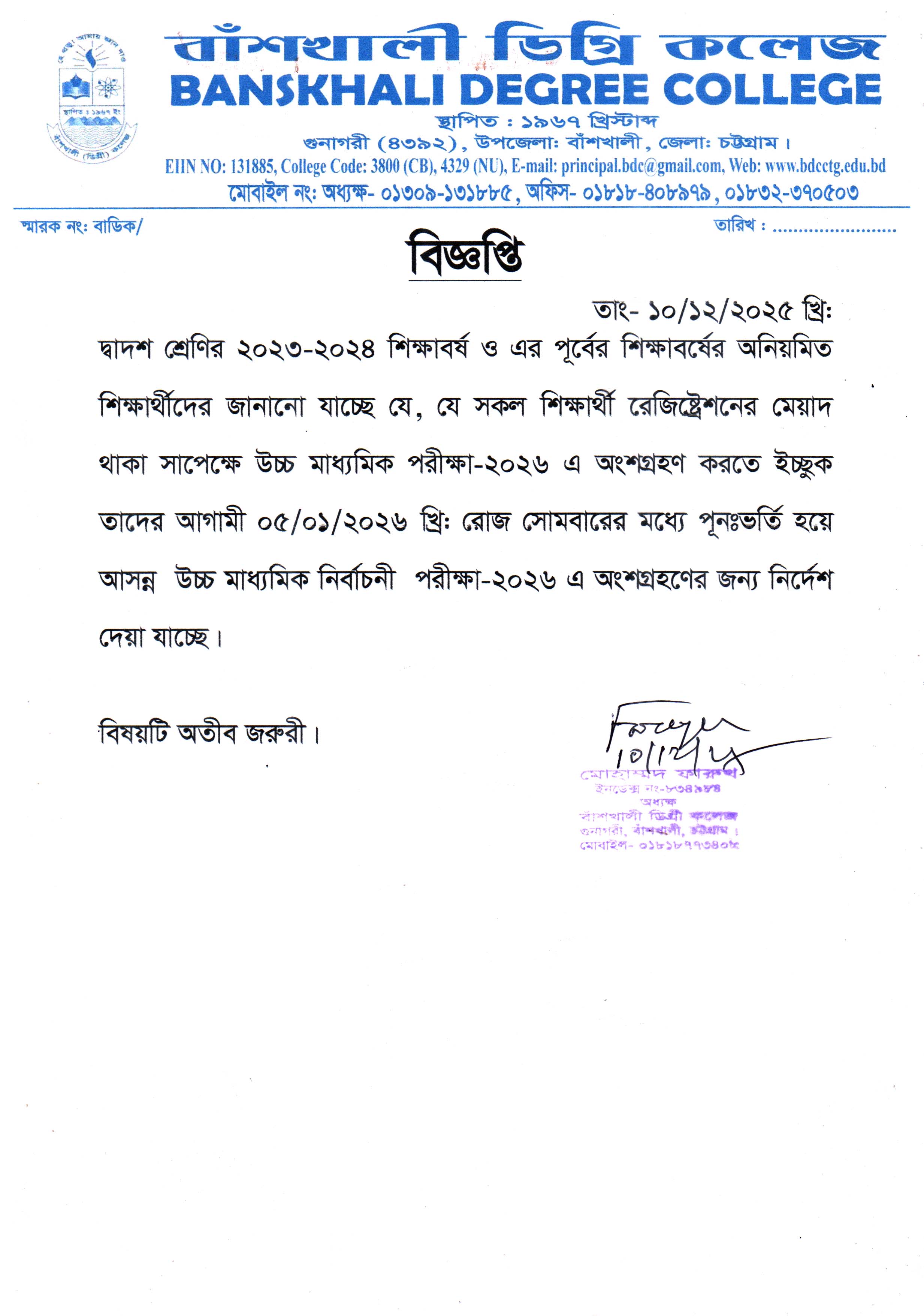 12/10/2025 ২০২৬ সালের উচ্চ মাধ্যমিক পরীক্ষায় অংশগ্রহণে ইচ্ছুক শিক্ষার্থীদের দ্বাদশ শ্রেণিতে ভর্তি বিজ্ঞপ্তি