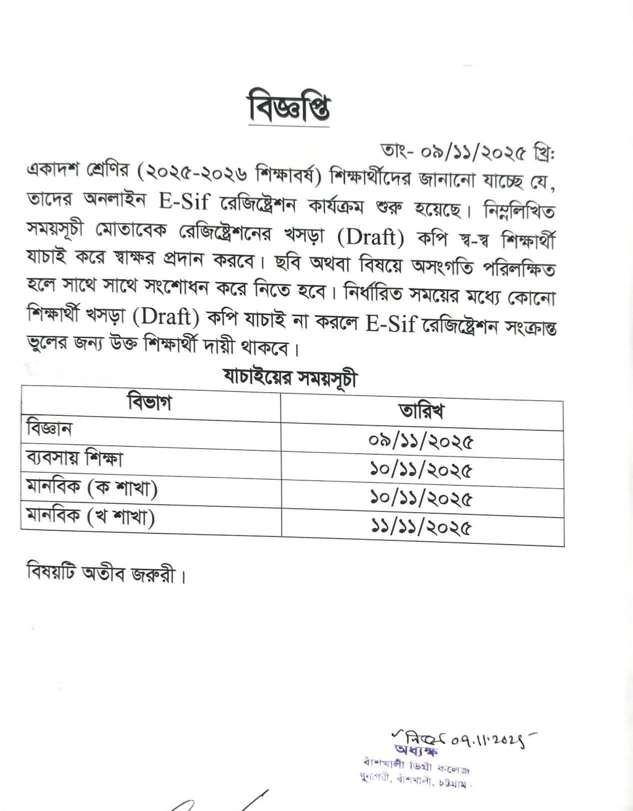 11/17/2025 একাদশ শ্রেণির (২০২৫-২০২৬ শিক্ষাবর্ষ) E-Sif এর চুড়ান্ত তালিকায় স্বাক্ষর প্রদানের নোটিশ