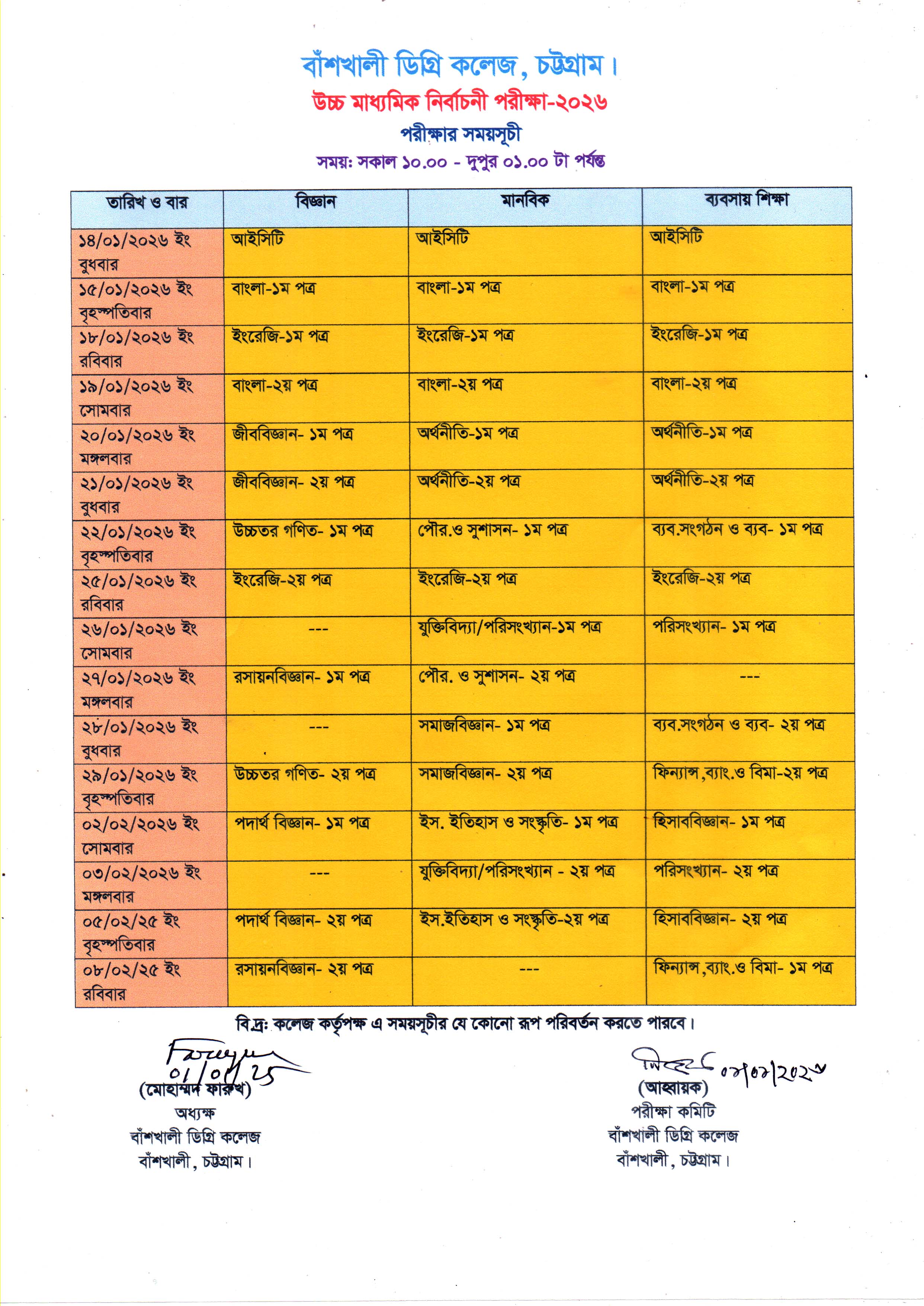 01/01/2026 উচ্চ মাধ্যমিক নির্বাচনী পরীক্ষা-২০২৬ এর সময়সূচী