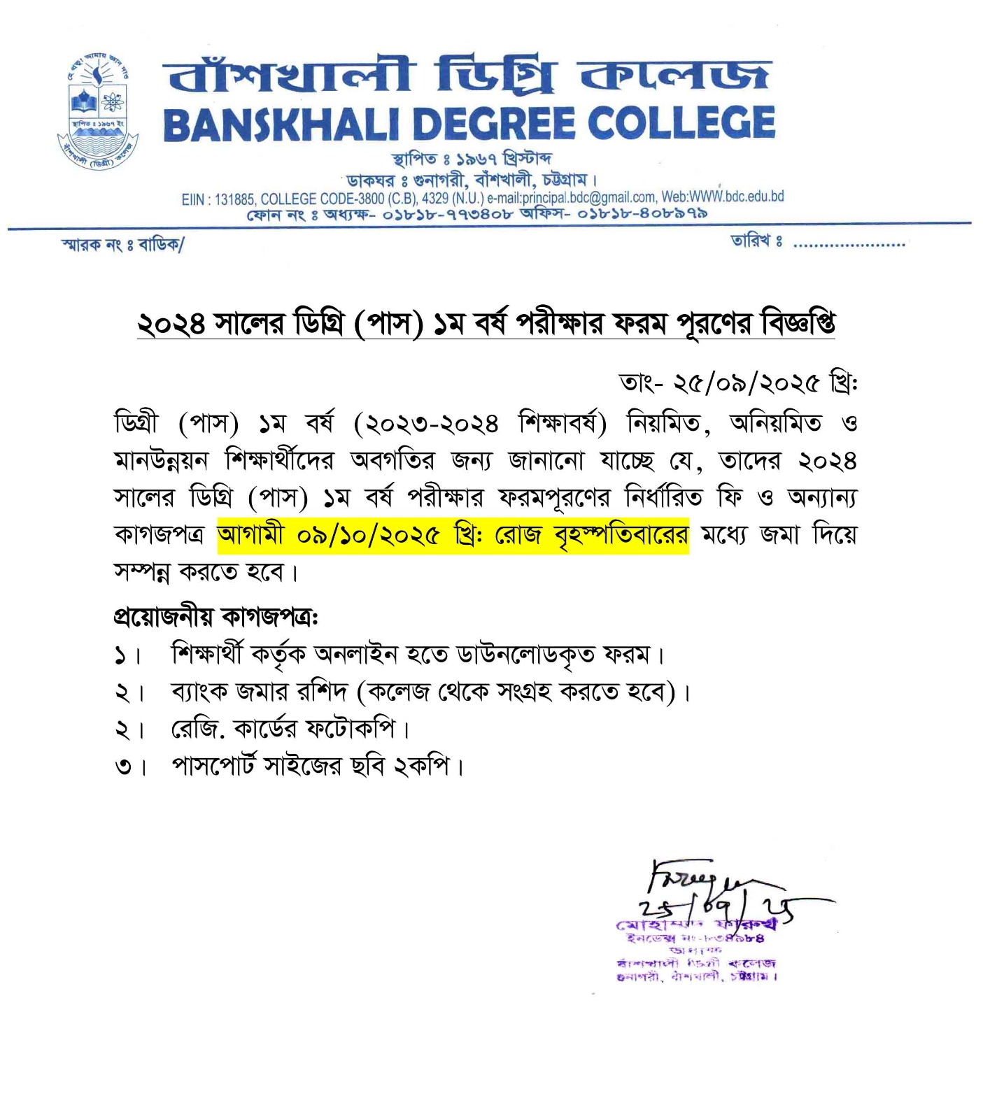 09/25/2025 ডিগ্রি (পাস) ১ম বর্ষ পরীক্ষা ২০২৪ এর ফরমপূরনের বিজ্ঞপ্তি
