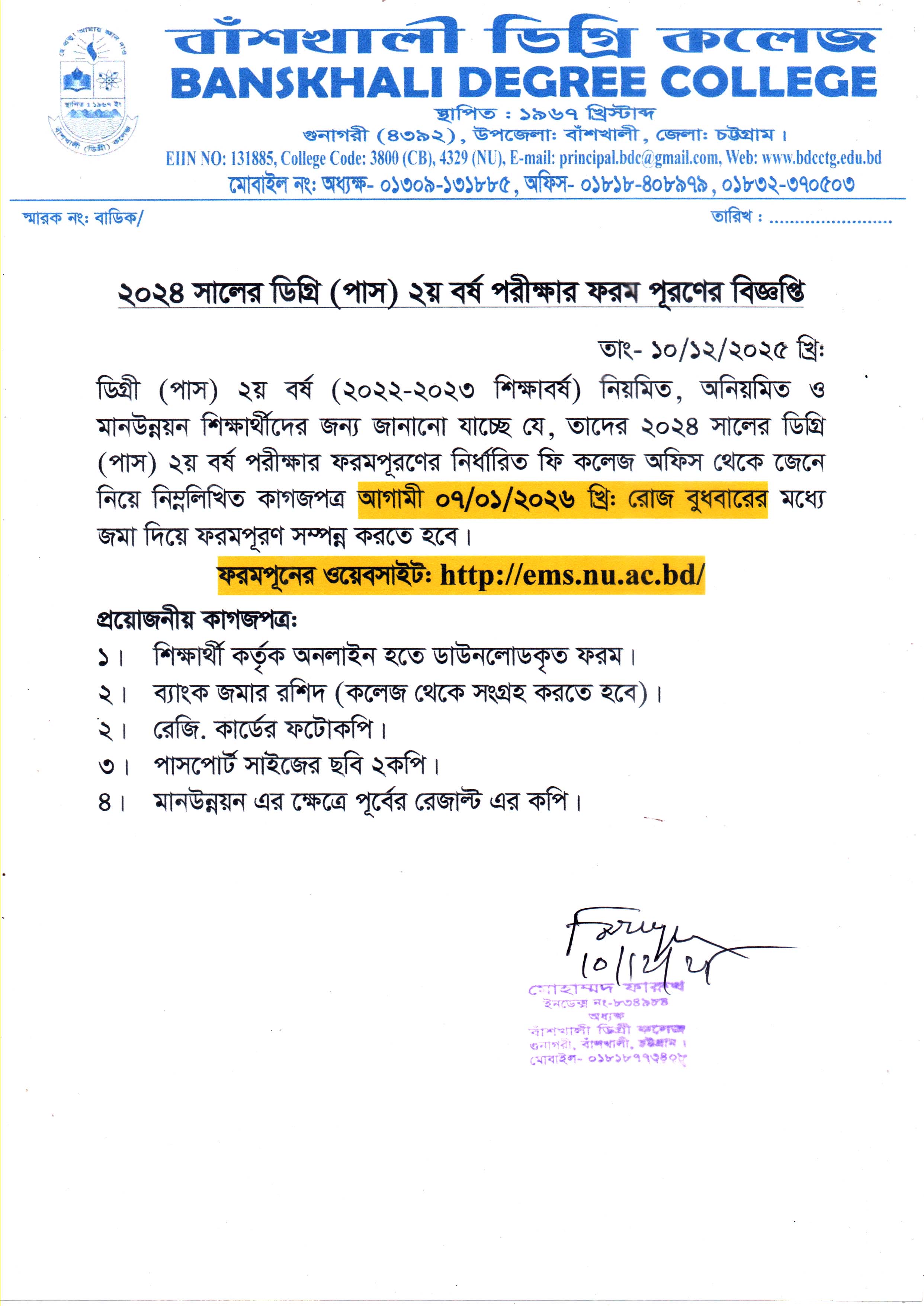 12/10/2025 ২০২৪ সালের ডিগ্রি ২য় বর্ষ পরীক্ষার ফরম পূরণের বিজ্ঞপ্তি