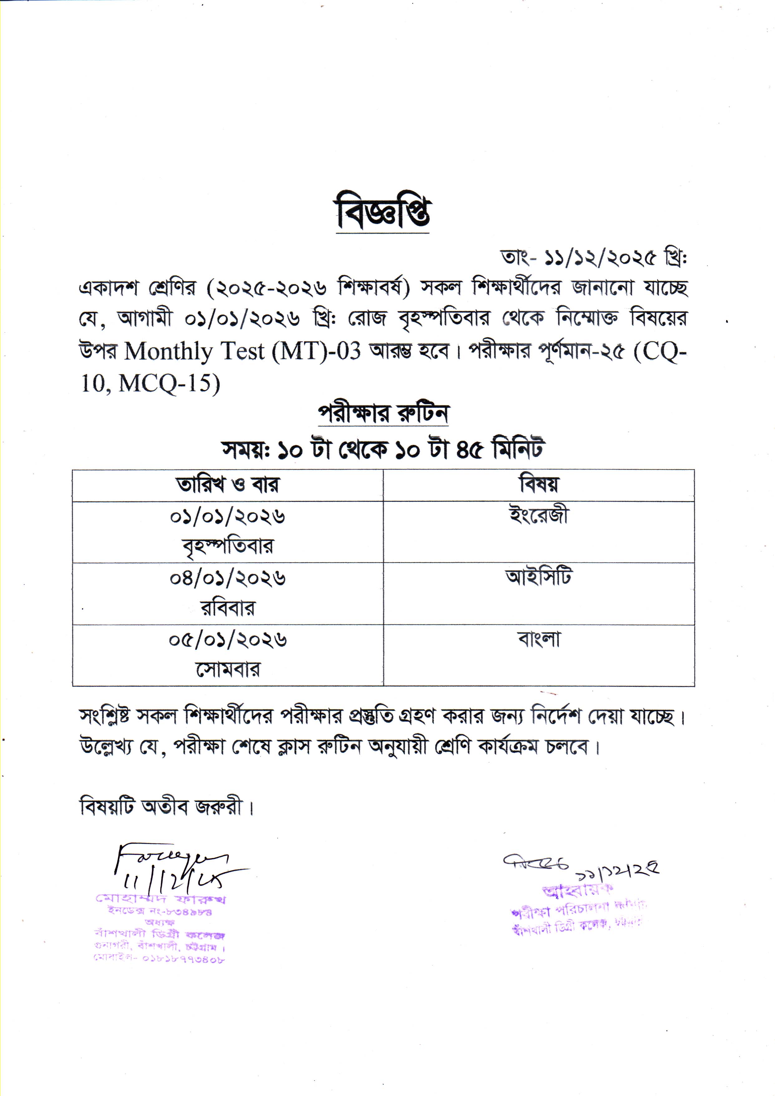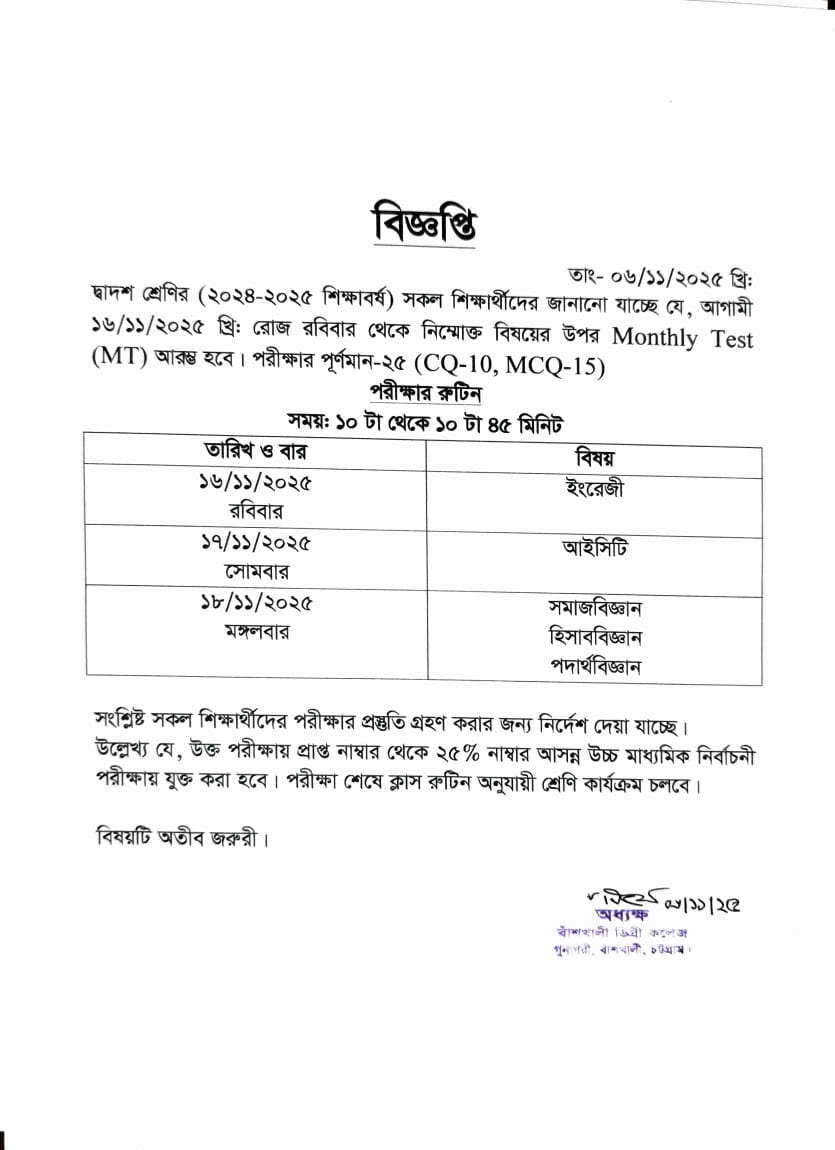 11/25/2025 একাদশ শ্রেণির (২০২৫-২৬ শিক্ষাবর্ষ) Monthly Test এর নোটিশ