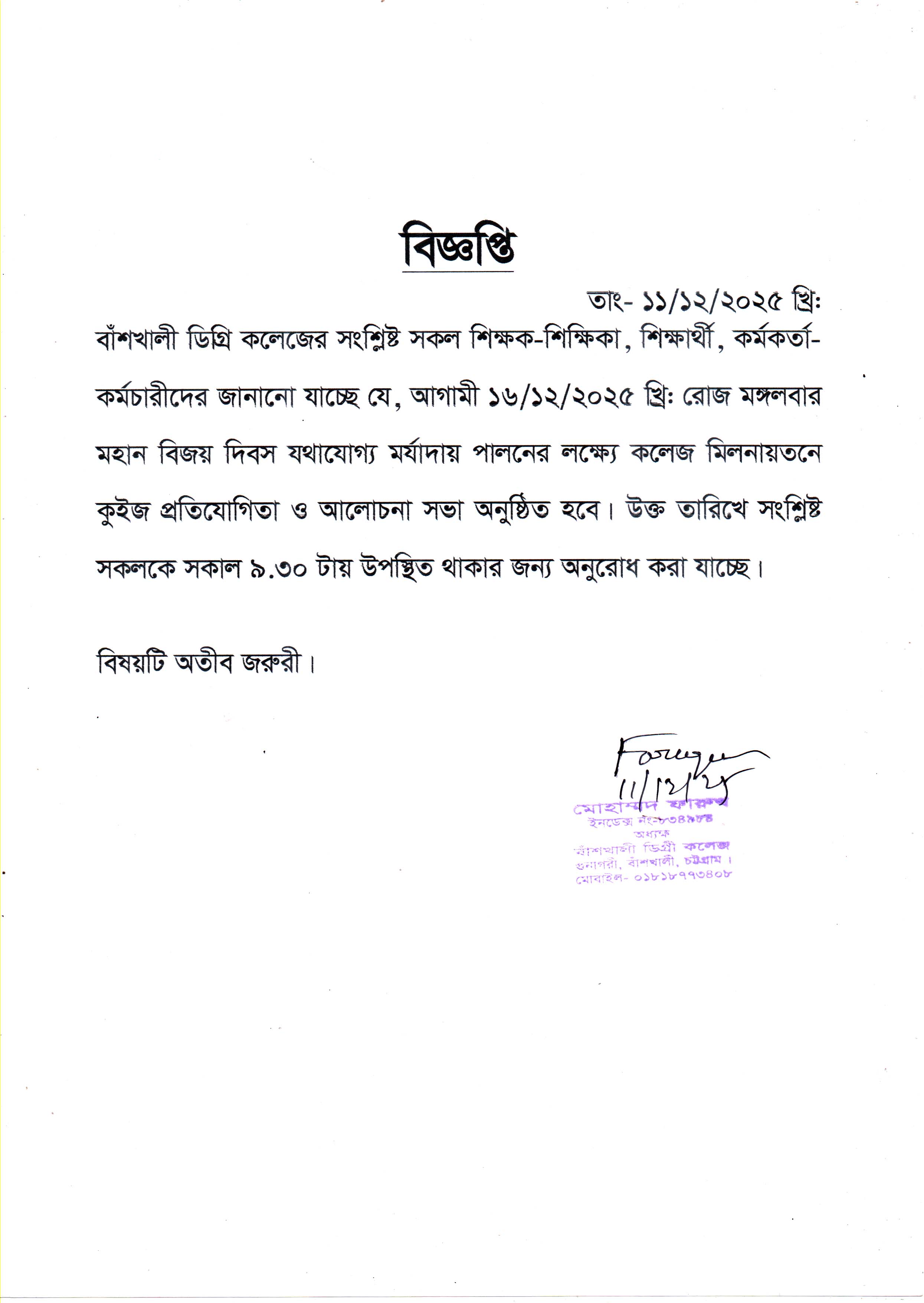 12/11/2025 বিজয় দিবস উদযাপন ‍উপলক্ষ্যে নোটিশ