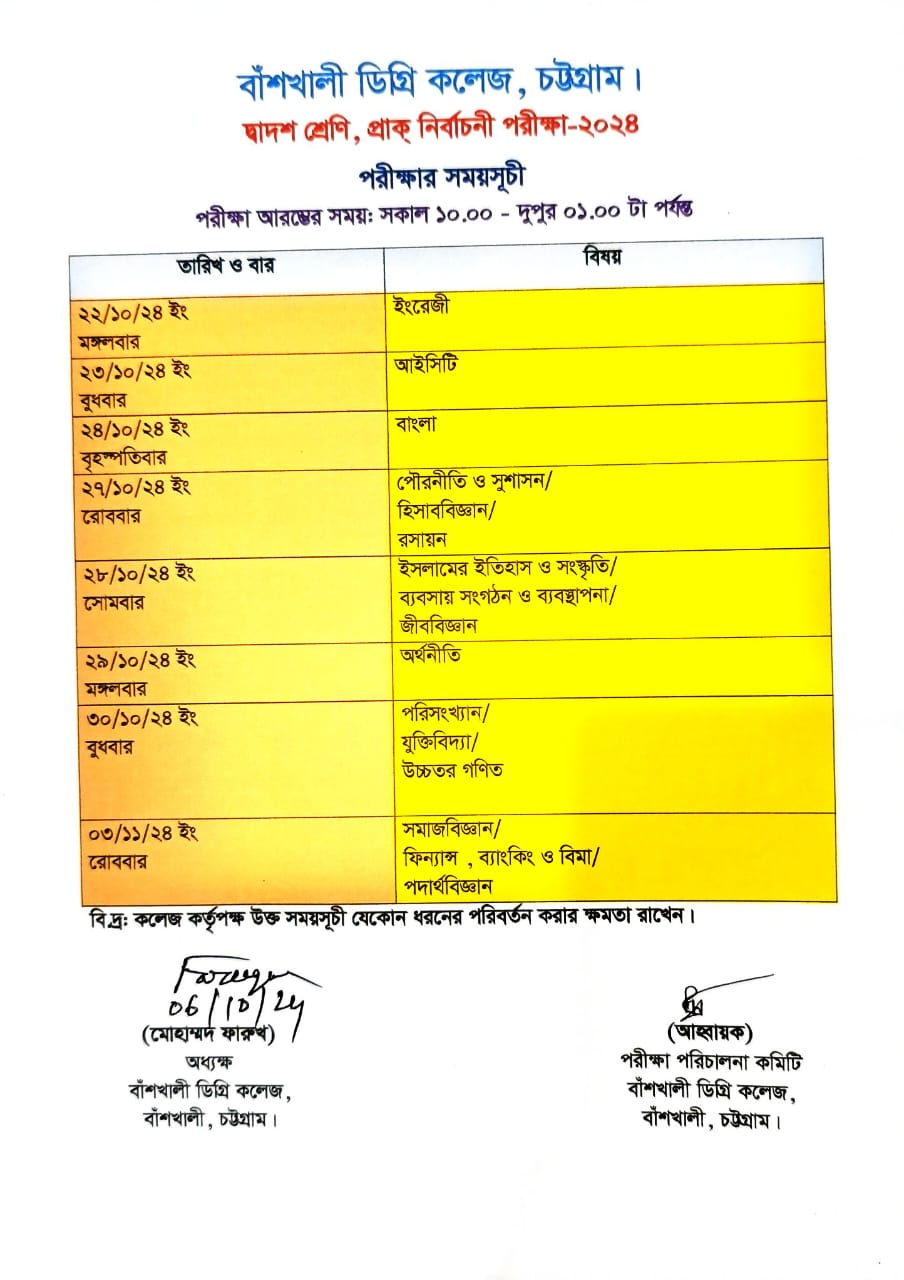 10/09/2024 প্রাক নির্বাচনী পরীক্ষা ২০২৪ এর রুটিন