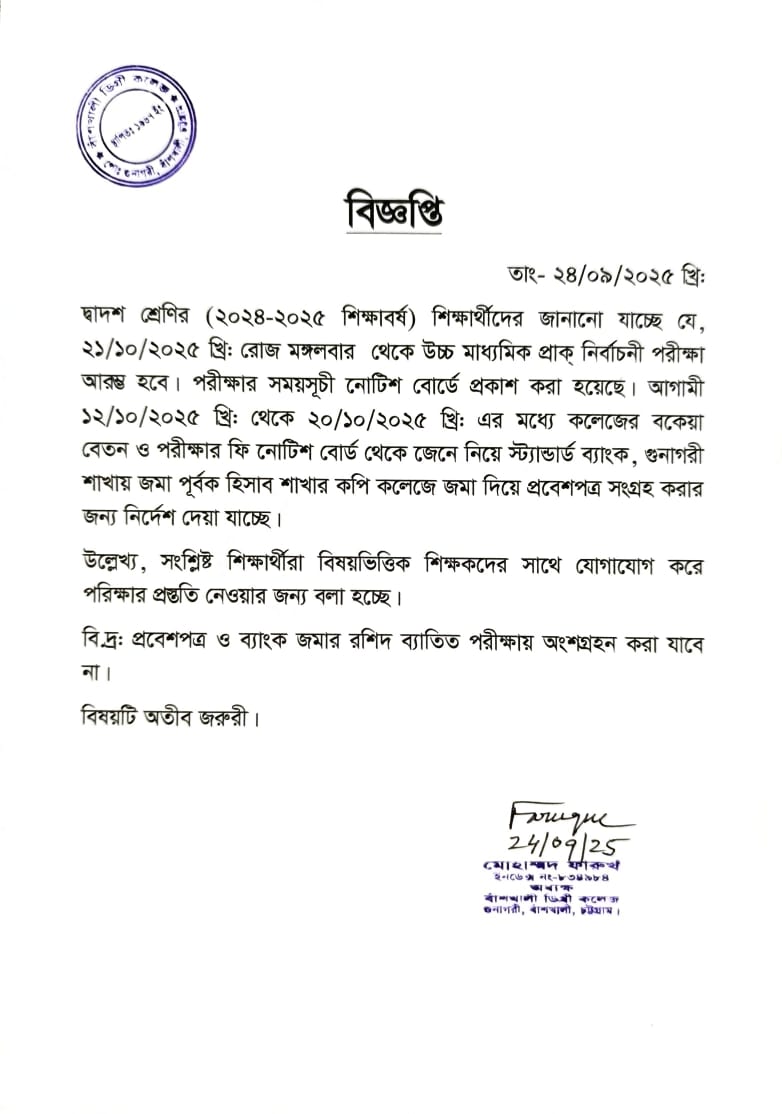 09/24/2025 উচ্চ মাধ্যমিক প্রাক্ নির্বাচনী পরীক্ষা ২০২৫ এর ফি প্রদানের নোটিশ