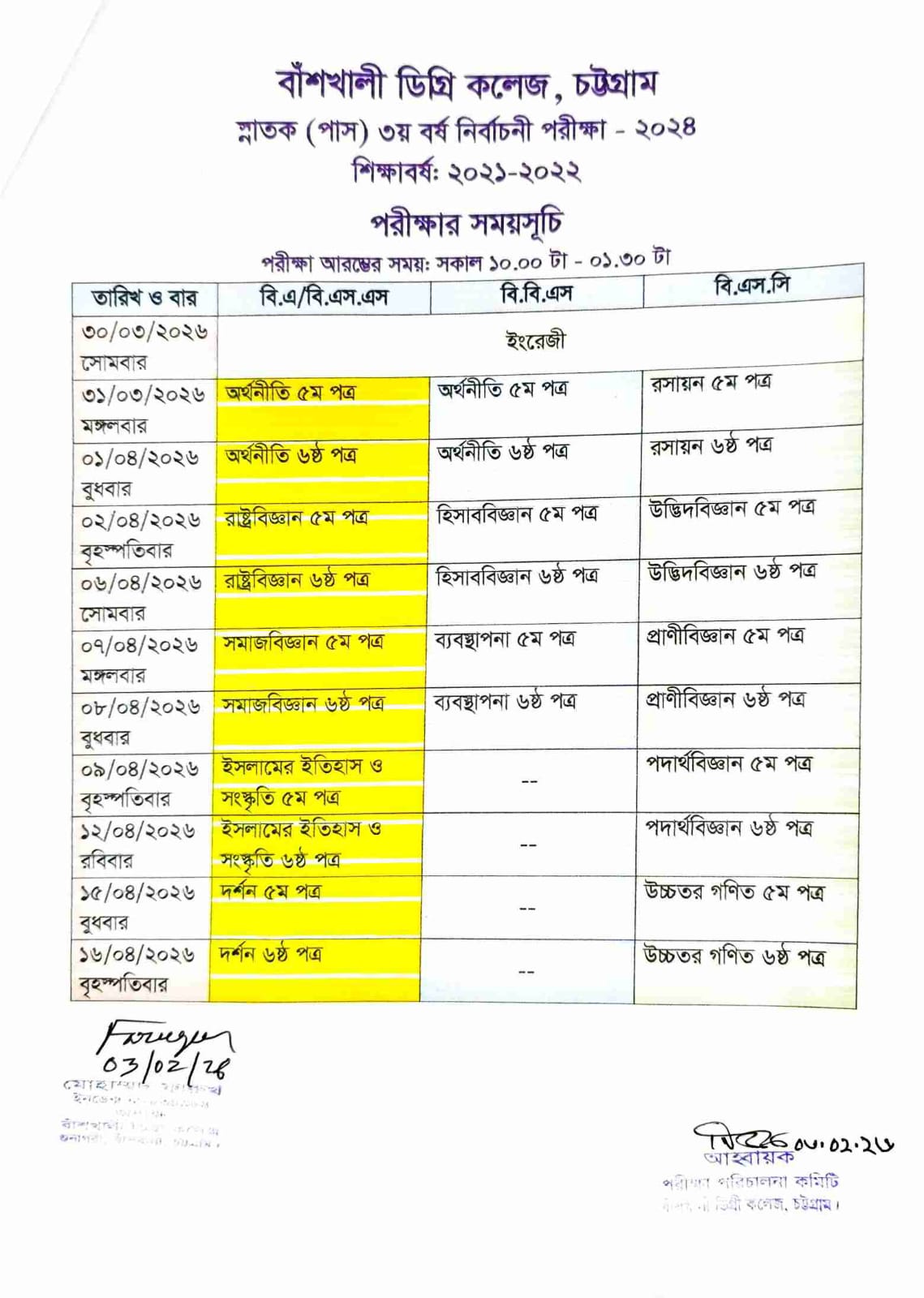ডিগ্রী (পাস) ৩য় বর্ষ নির্বাচনী পরীক্ষা ২০২৪ (অনুষ্ঠিতব্য ২০২৬) এর সময়সূচী