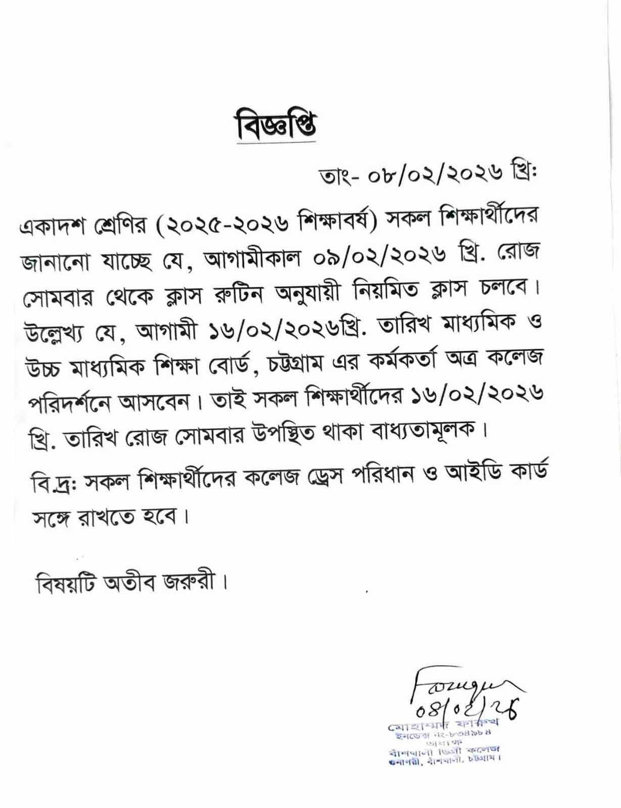 একাদশ শ্রেণির (২০২৫-২০২৬ শিক্ষাবর্ষ) শিক্ষার্থীদের ক্লাস সম্পর্কিত বিজ্ঞপ্তি