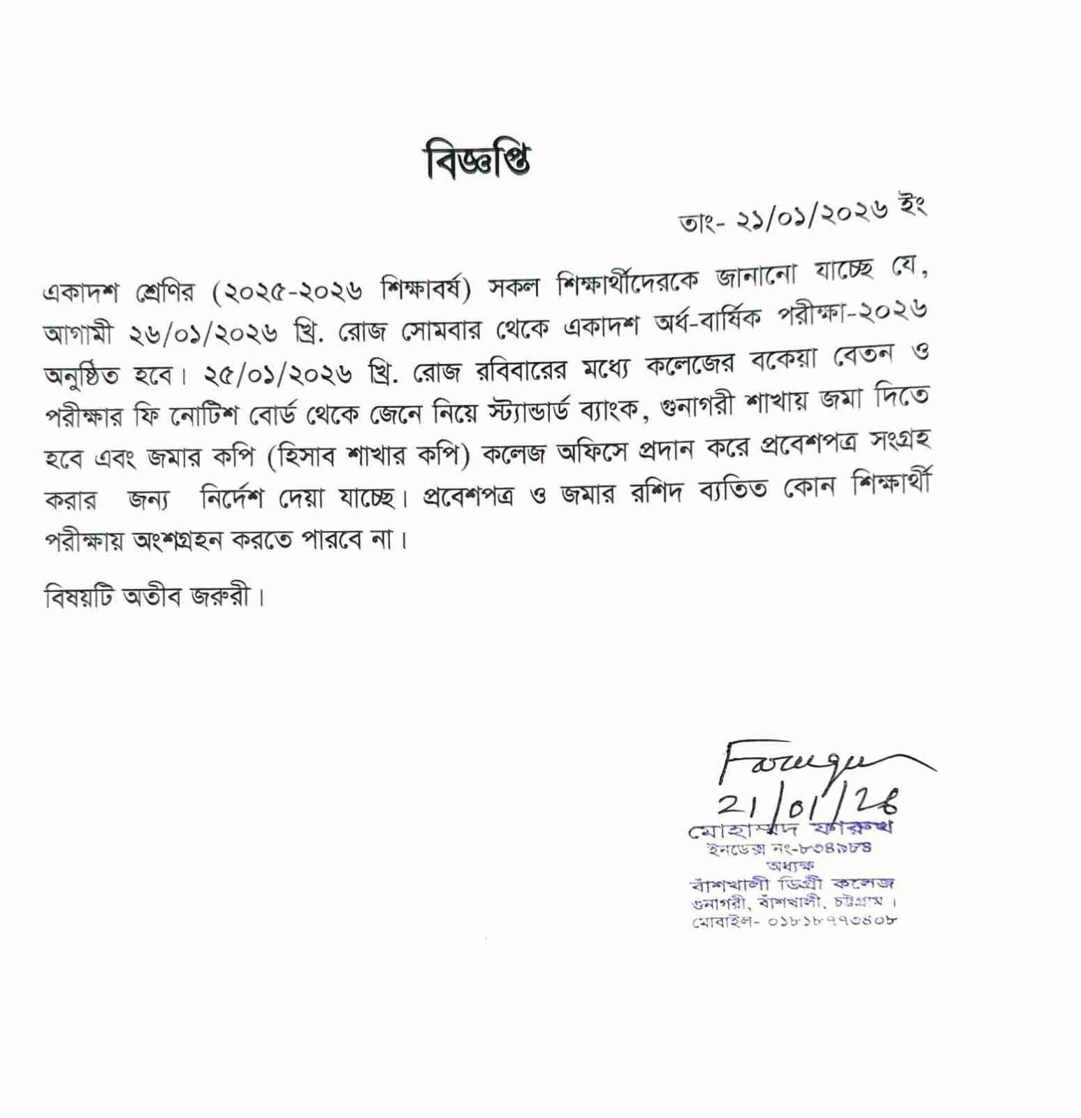 একাদশ শ্রেণি (২০২৫-২০২৬ শিক্ষাবর্ষ) অর্ধ-বার্ষিক পরীক্ষা-২০২৬ এর ফি প্রদানের নোটিশ