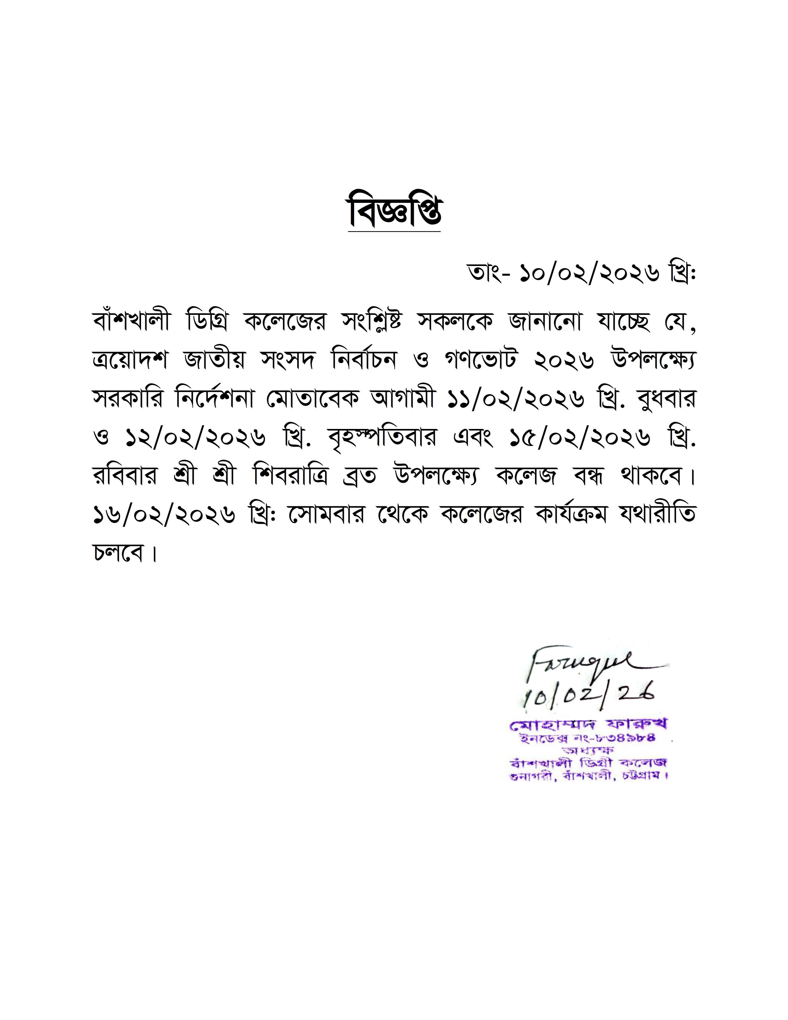 কলেজ বন্ধের বিজ্ঞপ্তি